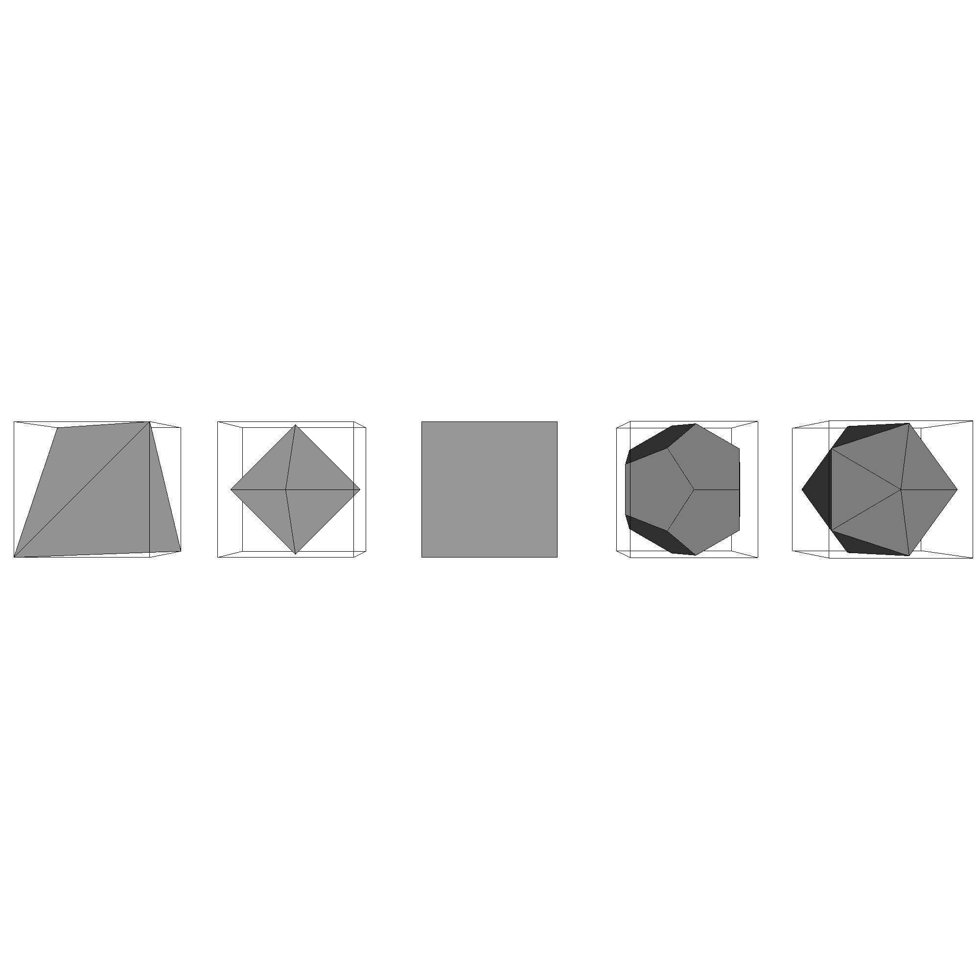 | Curl | Dodecahedron | Dome | Duck | Egg | Fukuda's tetrahedron |